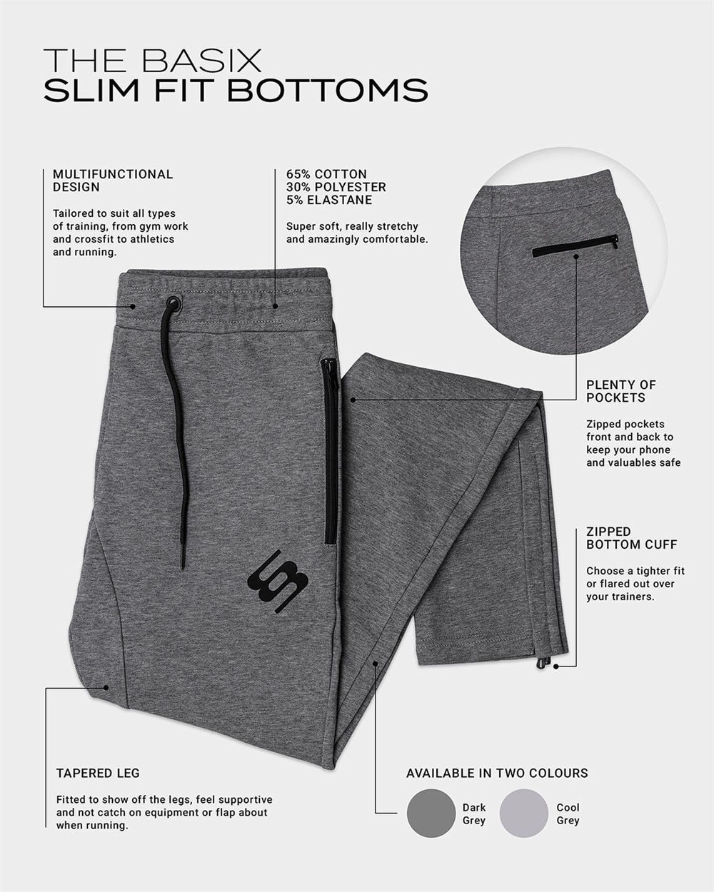 The BASIX collection is all about training fundamentals. Simple and straightforward multifunctional activewear catering for everyone from advanced weightlifting gym goers and cardio kings to treadmill newbies and street pounders.MATERIAL